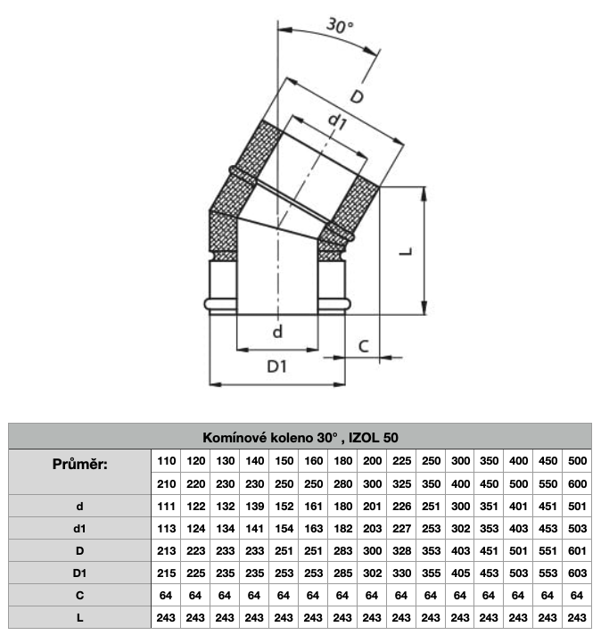 Komínové izolované koleno 30° ø 150/250 mm, systém IZOL 50