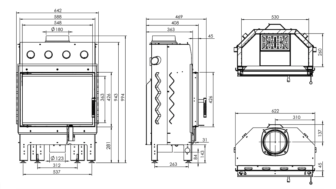 - Speciálně navržená zadní část tělesa umožňuje přívod sekundárního vzduchu do horní části pece. Umožňuje zvýšit účinnost zařízení spalováním výfukových plynů.