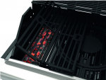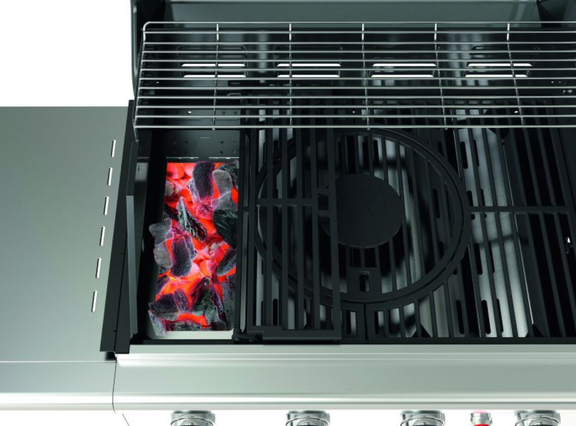 Rošt modulárního grilu je sklopný, takže tác na dřevěné uhlí jednoduše vložíte do jednoho ze 4 hořáků, naplníte dřevěným uhlím a pak si můžete vychutnat grilované jídlo s kouřovou příchutí.